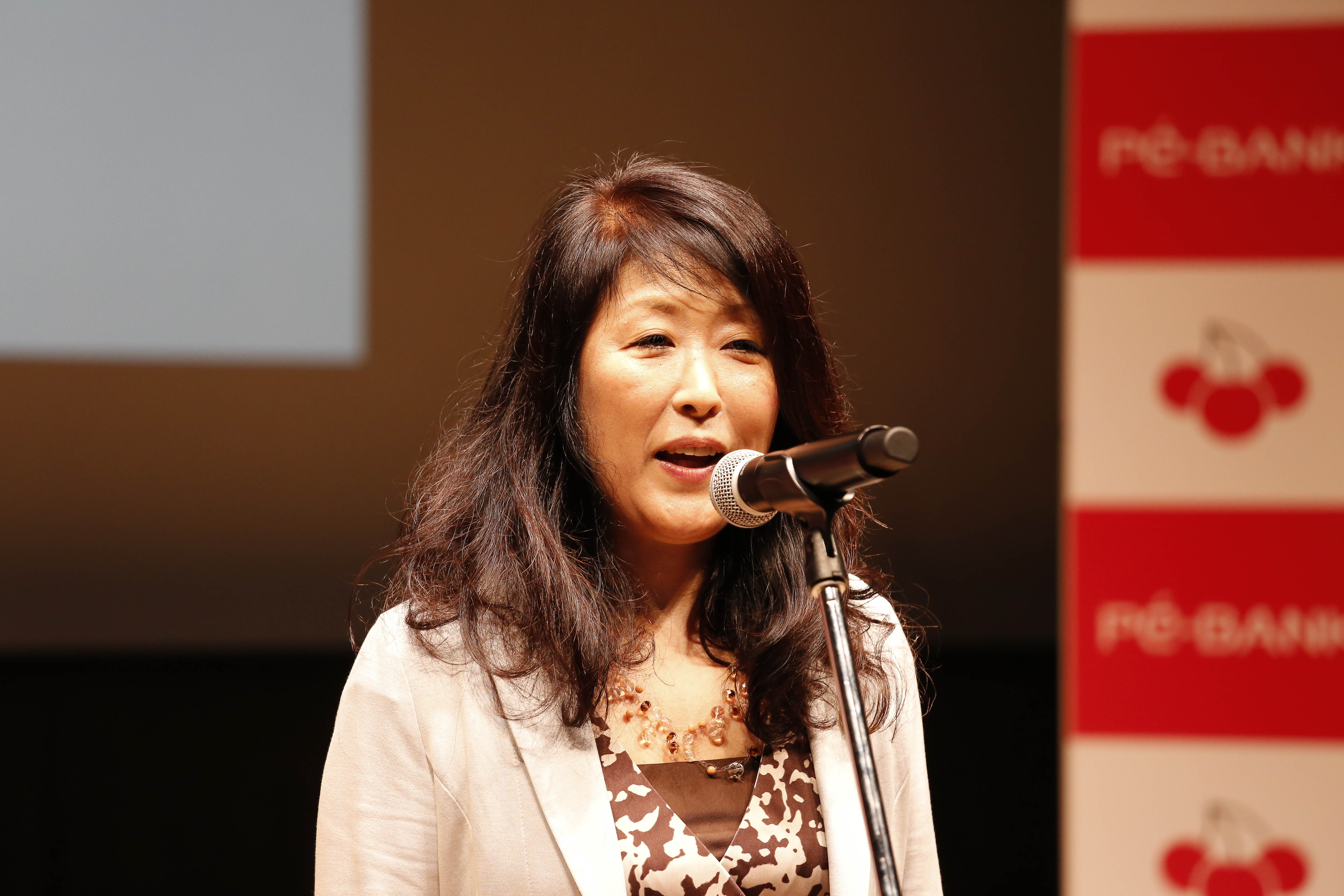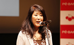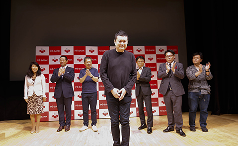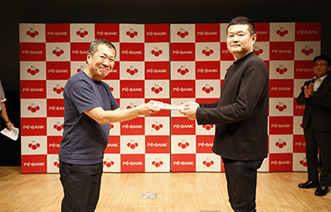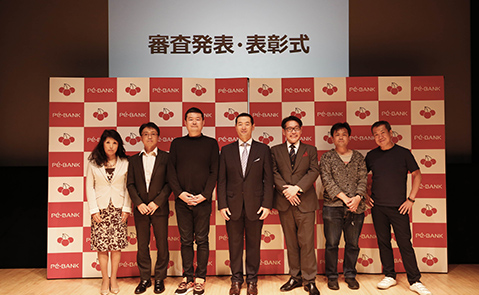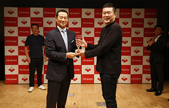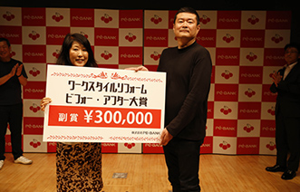 表彰式がはじまり、まず特別審査員佐々木俊尚氏より大賞の賞状が贈られます。続いて特別講演ゲストである桑田真澄氏からトロフィーの授与が。最後に株式会社PE-BANK代表取締役社長 櫻井多佳子から賞金の目録の授与が行われ、折原さんは満面の笑顔。再度来場者の方から割れんばかりの拍手が送られました。